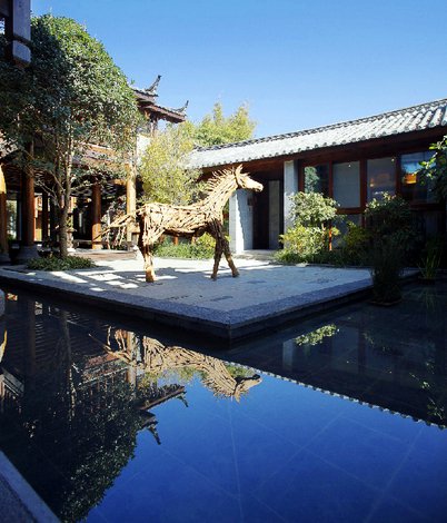 ——“在小巧别致的院落空间内,许多纳西古民生活与劳作的物件在设计师造美的眼睛里也萌发了新的创美力。院角几根栓马柱用粗大的麻绳栓接在一起,悬挂鸟笼,马帮翻山越岭的沧桑岁月似乎在这里沉淀下来,与闲逸精致的逗鸟生活奇妙结合了,一盆翠绿的修竹似乎也掩盖了石磨曾经轰轰作响的声音,这些劳作之物已褪去日常使用价值,化作供人缅怀或者审美的景观器物。”
