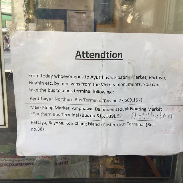 看攻略都说胜利纪念碑有mini巴士可以前往于是毫不犹豫的到了纪念碑(依旧嘟嘟车180B,司机还跟坚定的告诉我 纪念碑有可以坐到美功的mini巴士),首先问了警察在哪里坐车去美功,然后他热情的指了个方向,说的泰语我也没听懂,就走到对面。发现没有mini巴士的乘车点,全是公交车站乘车点,然后问了问卖票的阿姨,阿姨跟我们说了一大堆话,就只听懂了要坐“515”,也不知道要坐到哪里,依旧一脸懵B,她给我们指了对面的一个乘车点,然后过去了也没有发现有515,又问咨询台的老大爷,老大爷才让我拿出手机拍了上面的这张图,终于懂了要坐515去车站,于是在纪念碑绕来绕去浪费的时间应该有1个多小时。