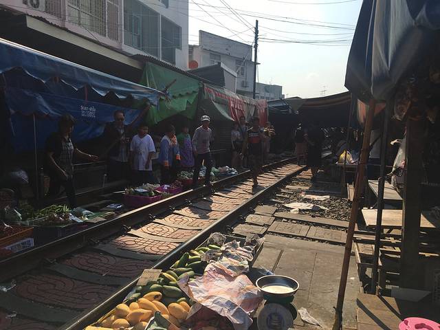 到达美功的时候已经2.50左右了,看网上写的2.30有一班列车要通过,看来那班已经错过了,下一班火车的时间是5.30,但是6点要去看萤火虫,时间来不及。本来对能够目睹火车通过的场景已经不抱希望了,在火车停靠的地方拍了拍照片,进铁道市场逛了一遍,准备坐双条车安帕瓦了。正好听到了广播,冥冥之中觉得是火车可能要开了,赶紧从旁边的店铺里窜到了铁道市场里面,果然商贩都开始不慌不忙的收东西,收雨棚。不到1分钟,原本全是棚,有些地方甚至要低着头才能走过去的市场,什么障碍物都没有了,所有人现在铁道两旁等待火车经过。