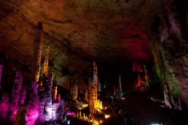 上午,我们首先来到黄龙洞“一探究竟”。黄龙洞总共有13个大厅,96条走廊,这对于方向感不太强的朋友而言,真的是极具挑战性。穿过双龙迎宾,我们来到第一个大厅聚会厅。一进去立刻有一种豁然开朗的感觉,但旁边导游却说,这是13个大厅面积最小的一个,弄得笔者好不尴尬。建议大家多去偷听下带团导游们的讲解,在游玩之余,还能增加学识,反正是免费的嘛!(PS:哈哈哈……)大厅里有一处被灯光装饰得异常华丽,一看名字叫“龙舞台”,我想象了一下龙王爷在上面跳舞的样子,却不禁想到了“刘老根大舞台”……黄龙洞里有一条地下河,有兴致的朋友还可以坐船观赏哦!不过,笔者想到的却是盗墓笔记里的一幕……真想体验一下啊,可惜时间不允许,只好作罢,留下了一个遗憾。不过有遗憾才有念想嘛!