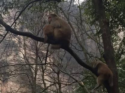 在金鞭溪尽头,我们走到了大氧吧广场。不得不说,这里的空气真的是清新涤荡,旁边的导游一个劲儿在跟游客说,“这里的空气拿到美国能卖5美元”!山里的猴子猴孙们也在这里聚居,不时有人向他们投放食物。不过,还是建议驴友们不要去轻易招惹这些“机灵鬼”。我们坐了没多久,就好几个小屁孩被猴子拿着小石子赶得哭天抢地的,哈哈哈哈……
