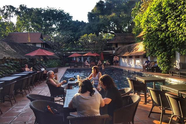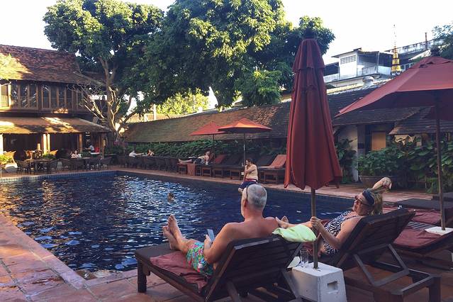 清迈古城真的有些“古(jiu)”,无论从街道,还是设施,都不如宁曼路那边,可能这是古城独有的韵味吧,在古城稍微闲逛了一下,16:00左右,很多周日夜市的商家已经开始着手准备了,因为周日夜市是从下午17:00才正式开始,于是就找了一家还不错的店,看看余阳,看看游泳池边玩耍的人群,倒也自得其乐!