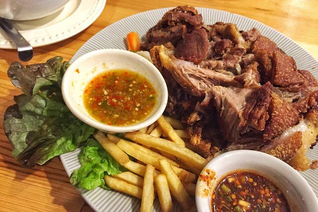泡了一会儿,决定去宁曼路找一家店,再去来一顿泰北菜,为清迈之行画上圆满的句号!这顿泰北菜,那么大的炸猪肘,好像只要200多泰铢吧~最后这顿饭一共才吃了500泰铢不到,真是性价比颇高!美食果腹之后,就准备回酒店取行李,外加等来接我们前往机场的车了!