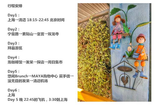 12:00准时退房,并寄存行李之后,开始最后一天下午漫无目的的游荡,计划是去宁曼路再逛一圈,姐姐想给侄女买点小礼物,然后去玛雅中心,家母给了任务是再去买一下NaRaYa的包,日常买菜可以用,然后去买点小的礼物给同事,再来就是去泡泡咖啡馆,吃吃泰北菜...最后就是坐等来接我们的车去机场!