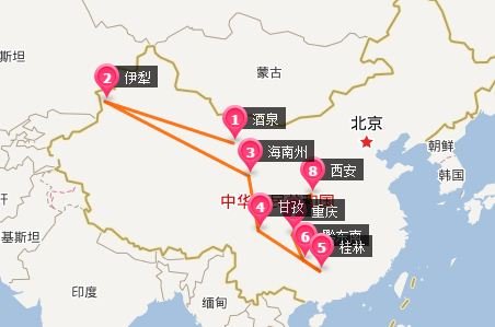 这次的旅行主要路线:西安--张掖--敦煌--乌鲁木齐--伊犁--喀纳斯--乌鲁木齐--西宁--青海湖--茶卡盐湖--青海湖--西宁--成都--九寨沟--马尔康--色达--康定--稻城--香格里拉--丽江--攀枝花--昆明--南宁--北海--南宁--桂林--龙脊梯田--桂林--阳朔--桂林--贵阳--镇远--重庆--西安