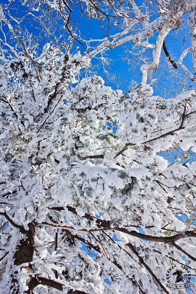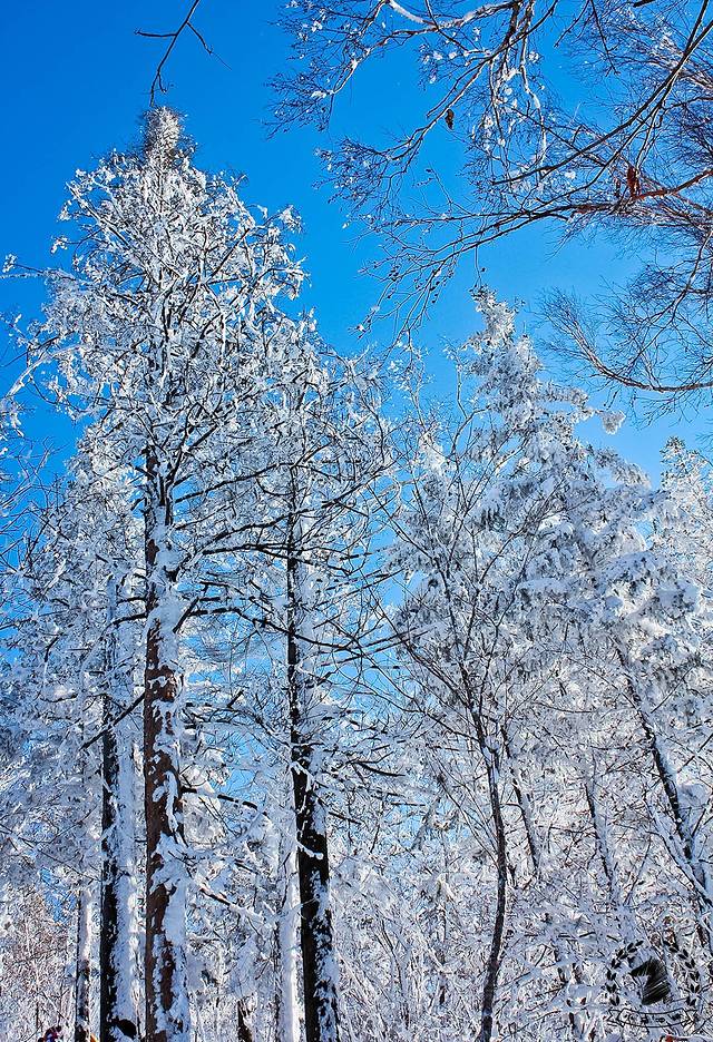 积雪落在枝叶上,一团团,一簇簇,犹如给树木穿上了新装。