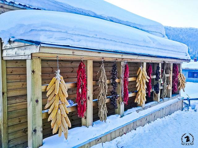 悬挂的作物,为这冰天雪地增添一抹美丽。