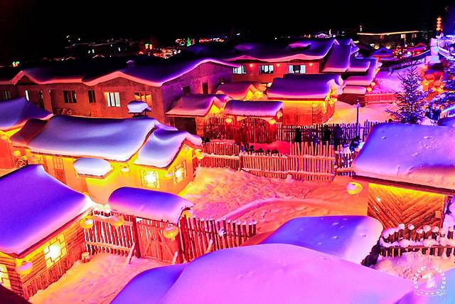 夜晚的童话小镇也褪去的色彩缤纷的晚礼服,向人们展示出银装素裹的一面。