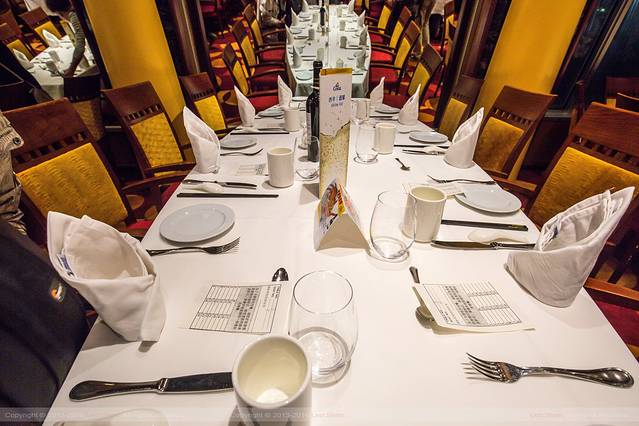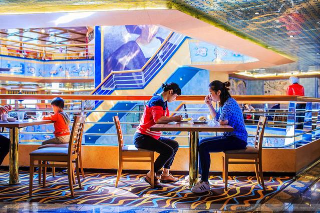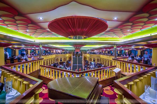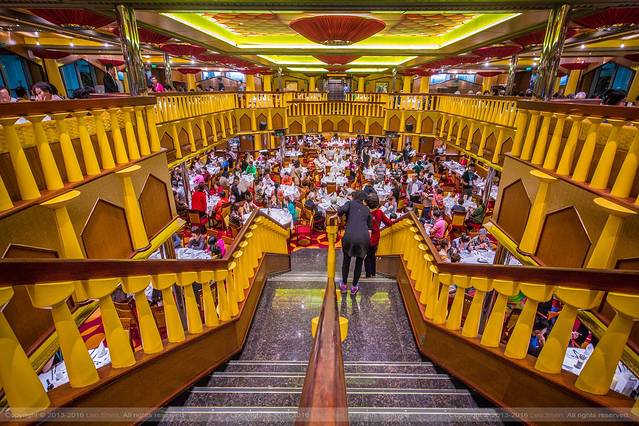 位于船中部,跨越两层甲板气势恢宏、装修典雅的西式主餐厅,免费提供各国美食。同样餐厅每日早餐和中餐皆为自助餐,晚餐为定食,所有宾客根据登船顺序会被分为两批用餐,每位宾客都会有固定的座位,所以晚餐是无需提前占位,只要用餐时间到了即可前往用餐。
