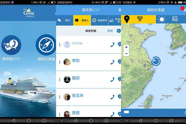 歌诗达同其他游轮公司一样在船上航海期间是提供免费的局域网联络工具,可以通过游轮内部WIFI下载链接,可以从这里搜索好友添加,进行简单的交流和电话联系,另外可以从同步的游轮仪表盘中得知目前游轮的位置和天气状况。