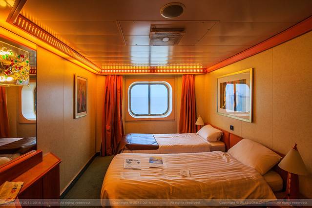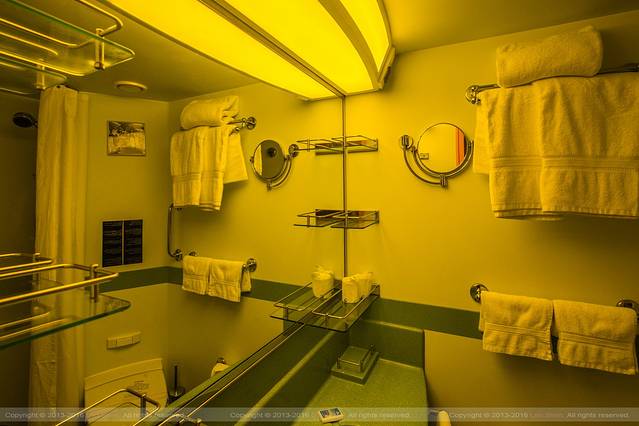 房间的面积虽不算大,但是麻雀虽小,五脏俱全,所有客舱均包括带淋浴和卫生间的私人盥洗室,并装有空调、卫星电视、电话、小冰箱、保险柜、吹风机和音乐播放设施。基本除了没有浴缸,设施接近大部分4星级酒店的标准,当然你不能完全以硬件和面积来比较,毕竟这是游轮。