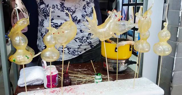 妹妹尝试了一下从没玩过的吹糖人 吹了只小猪