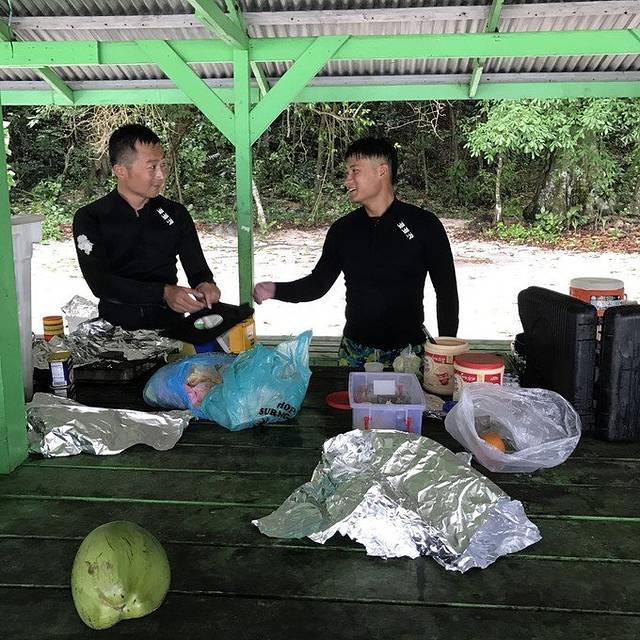 无人岛午餐钓上来的鱼儿们就是我们午餐中的一部分还有秘制猪排等。拍到了导游做饭的照片。