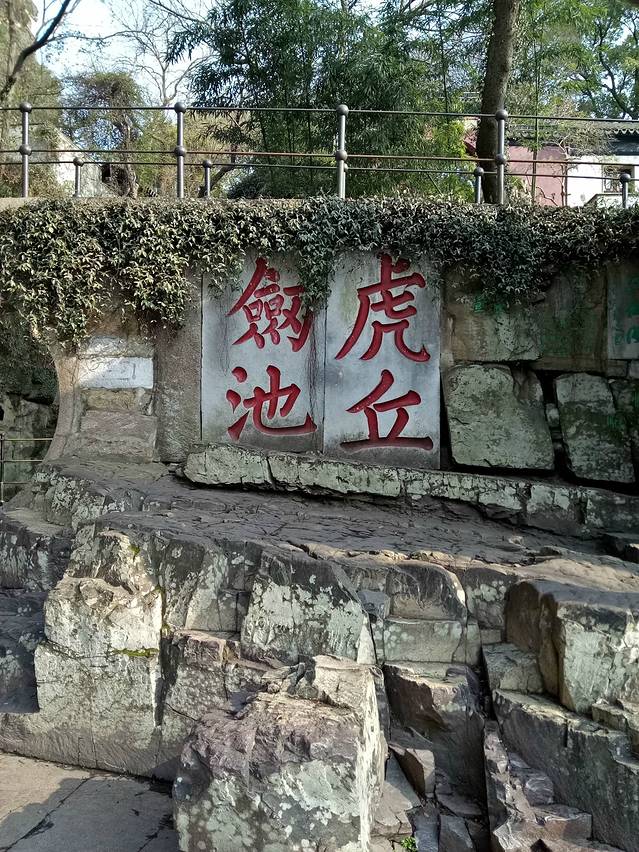 苏州虎丘最神秘、最吸引人的古迹是剑池。从千人石上朝北望去,“别有洞天”圆洞门旁有“虎丘剑池”四个大字,据记载,原为唐代大书法家颜真卿所书,后因年久,石面经风霜剥蚀,“虎丘”两字断落湮没。在明代万历年间,由一个名叫章仲玉的苏州刻石名家照原样钩摹重刻。但在笔锋之间,总能看出些许不同。所以在苏州有“假虎丘真剑池”的谚语。也有人说这句话是指阖闾之墓的秘密。
