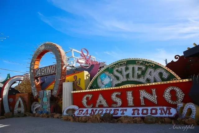 体验完滑索之后,去参观了 The Neon Museum,这是一家酒店改造而成的博物馆。霓虹灯博物馆里有150多个藏品,每一个都会向人们讲述他们特有的故事,谁设计了它,何时何地制造了它,怎样融入维加斯的发展进程。它们不但代表着从1930年至今的霓虹灯设计和技术的发展,而且见证了拉斯维加斯的发展。这些废弃的霓虹灯,虽然经过时间和阳光的侵蚀已经不再鲜艳,但巧妙的色彩组合设计仍呈现出精美的视觉效果,这也成为游人最喜欢拍照的地标。