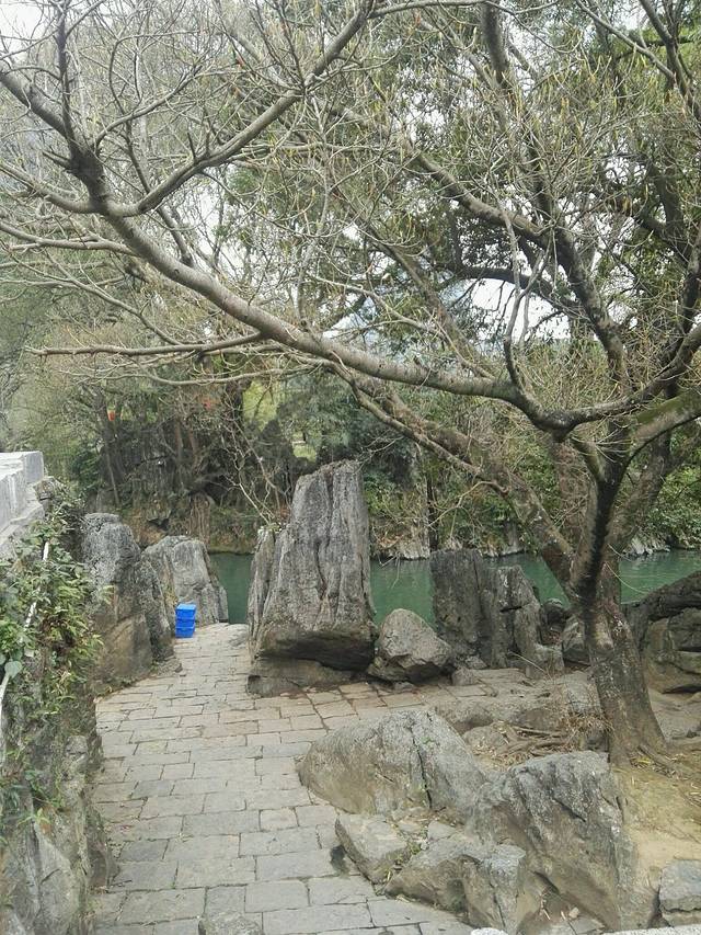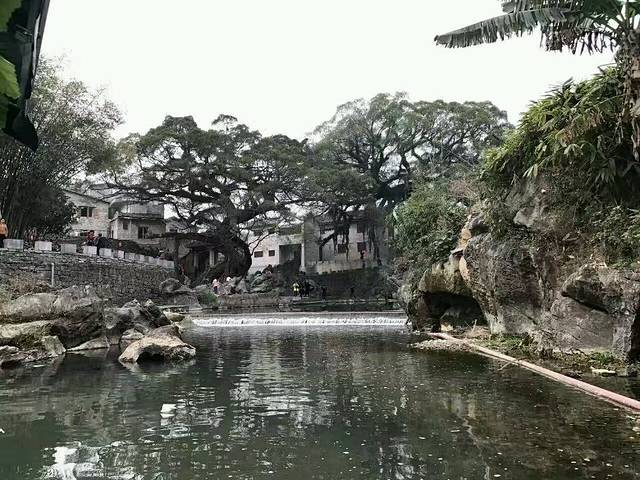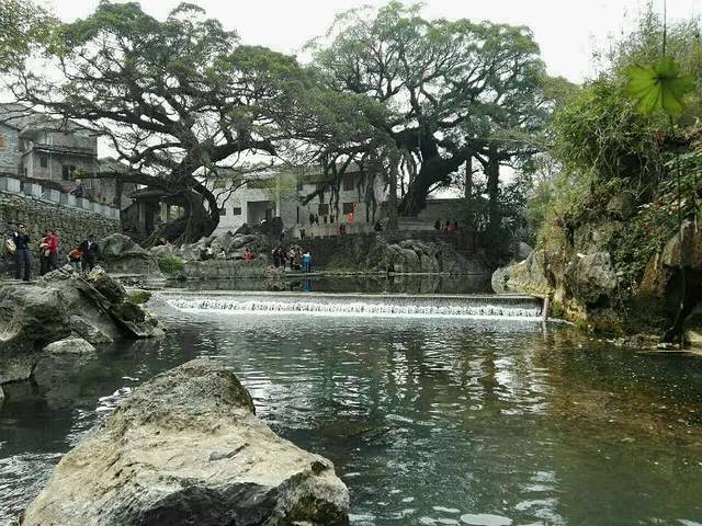 榕树下是一条清可见底的小河和一大堆巨石,巨石群已经被河水冲涮得光滑锃亮,小河水不深,但很干净,风乍起,吹绉一池春水 。
