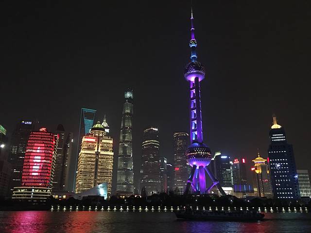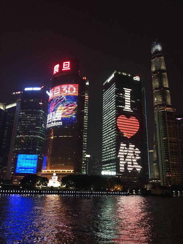 浦东沿江建筑物外观在LED灯光闪烁的效果下显示出美轮美奂的姿势,个个光彩夺目,尤其是LED屏不断闪烁出“HI魔都”字样时,能让游客惊叹上海精彩的魔力;当LED屏不断闪烁出“I♥侬”时,也让游客感到上海欢迎游客的热情。