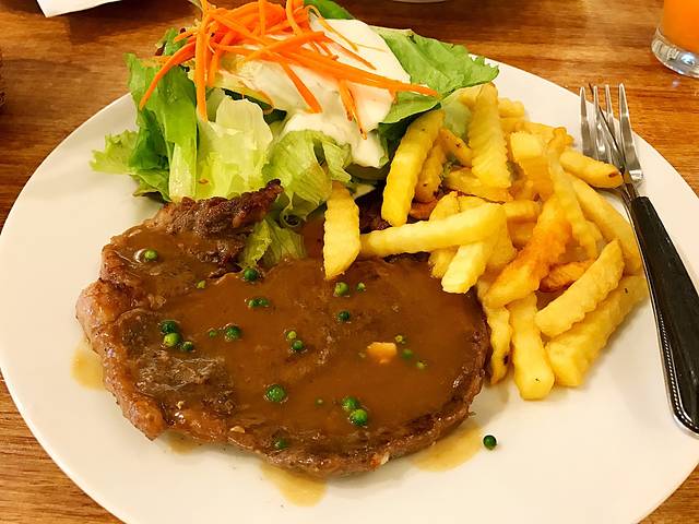 古城里每个十字路口处都有餐厅,随便一家都很不错,我们就近找了一家西餐厅。走进餐厅,一水的欧洲人。其实在泰国,遇到最多就是欧洲人,明明是一个东南亚国家却总会有种错觉,让你觉得自己置身于欧洲的小镇里。