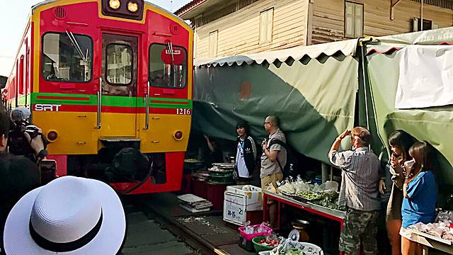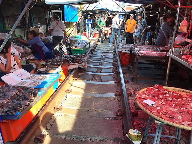 正常2个小时左右就可以到达美功,可我们赶上了堵车,大约3个小时才到,却刚好赶上有一班火车经过市场。