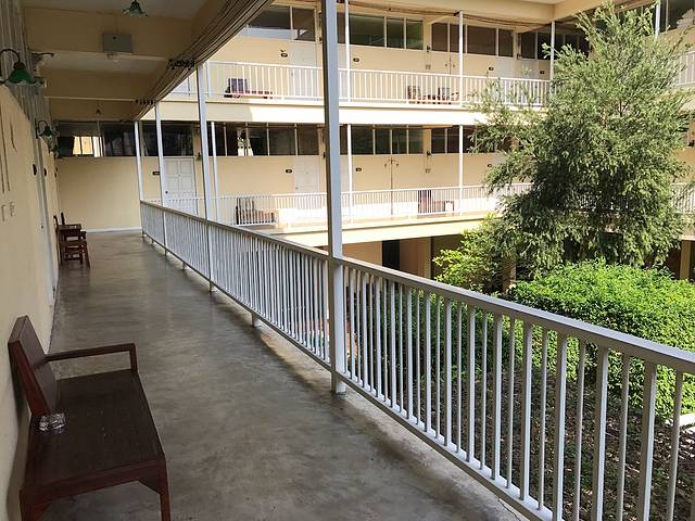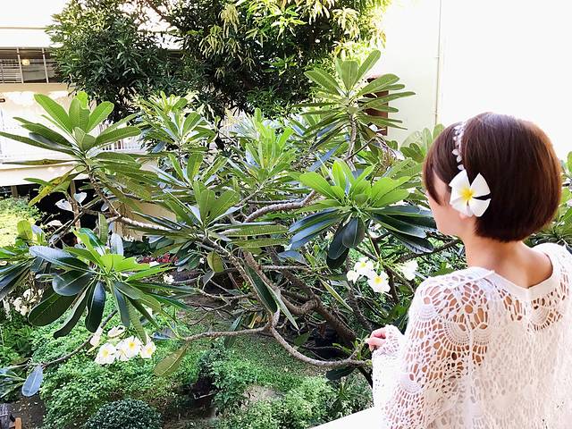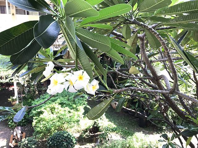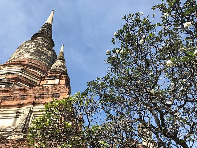 下了飞机就感受到曼谷的高温,索性躲在酒店里避暑,靠在阳台上一伸手就可以碰到满树的鸡蛋花。每个房间门口都有小椅子,坐着休息的时候遇到了隔壁的邻居,也是中国人,大家互相聊天,很有大学宿舍的感觉。