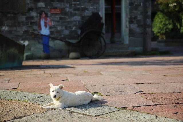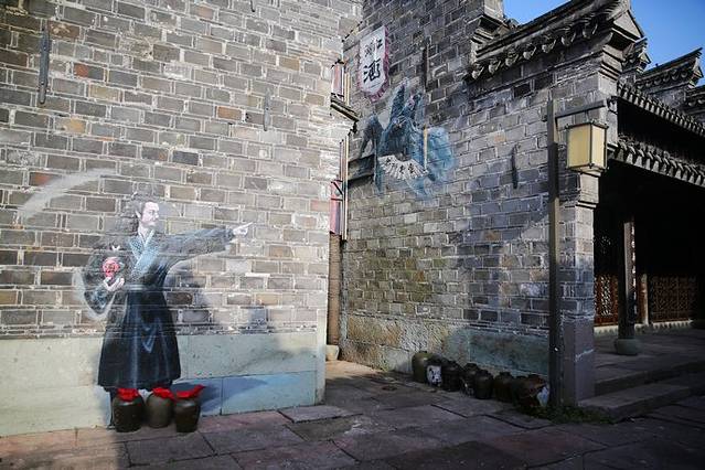 忽而,街道中间睡着的小狗被我的快门声惊醒,朝我一阵狂吠。江湖餐厅前堆放的酒坛,墙面上人物的潇洒画像,让人恍如置身于一处隐居江湖。