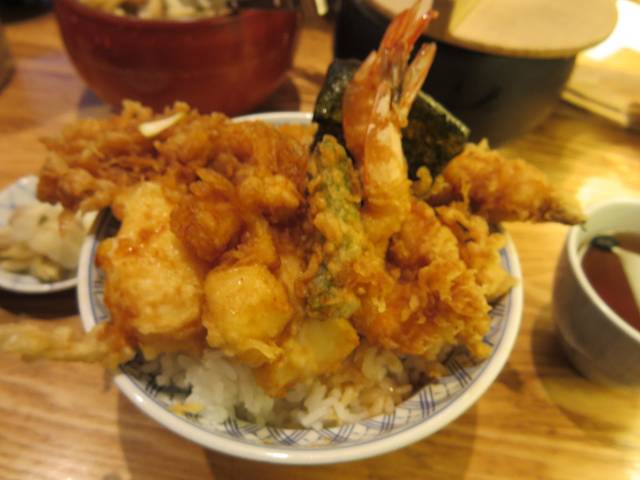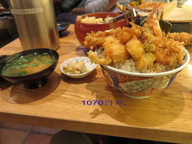 當然最後總是要介紹一下,的確是蠻好吃的。不過我覺得最主要有這麼多人,不只是因為好吃而是便宜。一條魚、兩隻蝦、一個蛋、還有一樣應該是花枝吧!加上兩種蔬菜,這麼多才$950日元,(我多點了120日圓的味噌湯)難怪這麼多人!下一次如果再來,只要排隊的人超過菜單我就不吃了!
