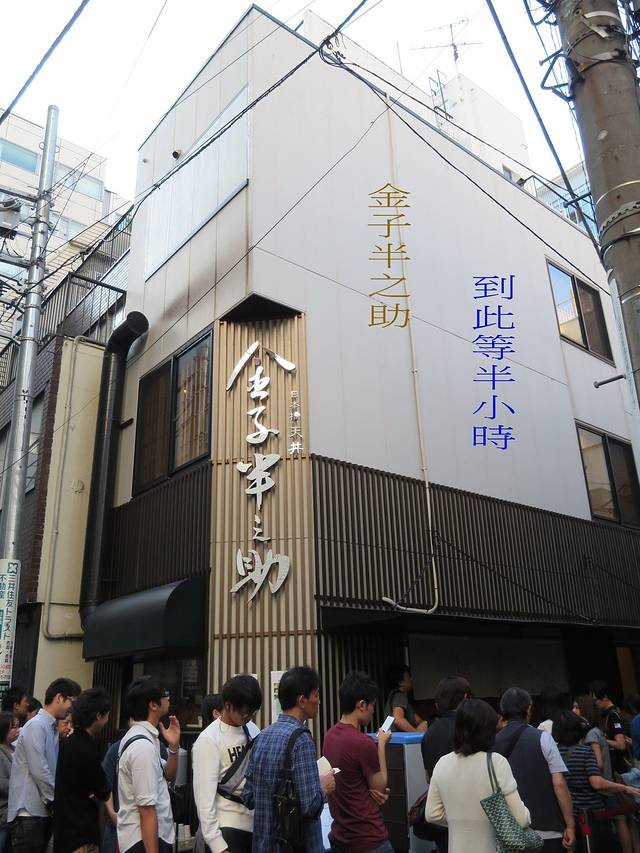 才剛排進去前面的日本人就告訴我大概要等一個小時。一個小時還好啦!我心裡這麼想,結果一個小時過後大概才走了不到三分之一,想一想都排了一個小時了,現在走掉不就什麼也沒有了嗎?還是繼續排吧!就這樣一直排一直排,最後排了快四個小時。每次都在想都等這麼久了,再多等一下再多等一下吧!也不是我一個人,相信所有排隊的人都是這樣想的,所以才沒有人走開!如果你要去吃,給你一個提示,你看到金子半之助招牌下有一張菜單,站在菜單前還要等半個小時,這樣子你就知道要排多久了。如果你和我一樣排到一個小巷口,就是有很多餐廳的小巷子口,那麼就要排四個小時,千萬記住!這裏和一蘭拉麵不一樣,因為拉麵吃的很快,而且位子比這裡多。