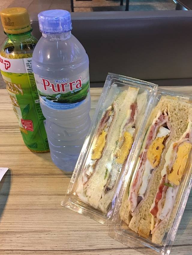 凌晨2.30的班机,延误到4点起飞,到曼谷已经天光了,饿到懵逼,在机场379猪买了两个冷三明治,开吃!