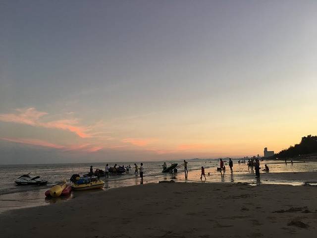 司机大哥很健谈,我们在车上聊天,他说泰国也是跟中国过春节放假的,春节比泼水节的假期还长,边开车他还唱了一段TAXI歌,好欢乐的性格~ 不想我们失望,还带我们绕到一个很多本地人的沙滩(CHA-AM),我们看到海上的香蕉船和飞天毯都好好玩的样子,虽然天色已晚了,但是和老公约定了明天如果能起床就过来玩。