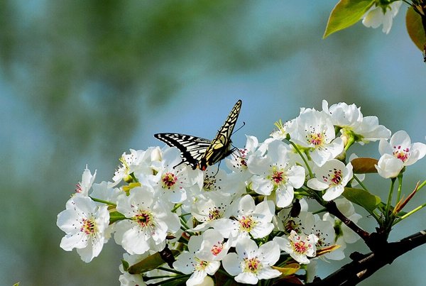 ‘忽如一夜春风来,千树万树梨花。’在温暖的春光中,梨花已经绽放了自己的笑脸。这里的一切都是纯洁的,一大片一大片,仿佛是一个个天使,高高的举起了自己的法杖,也把自己洁白的翅膀都展开了,把梨园打扮的让人有一种飘至云端的感觉。再看看那美丽的花朵像一位位舞蹈家,撑起了自己洁白的连衣裙,一边唱歌,一边舞蹈。那可爱的花蕊就应该是唱歌时不小心掉落的一个小音符吧!梨树的叶子长得很可爱,就好像一个个绿色的小精灵,在花朵后、树枝上玩起了捉迷藏。梨树好像母亲一样,精心的呵护着她的孩子——梨花儿、梨叶儿。梨树又好像它们的父亲,对它们形影不离,全力保护着它们。