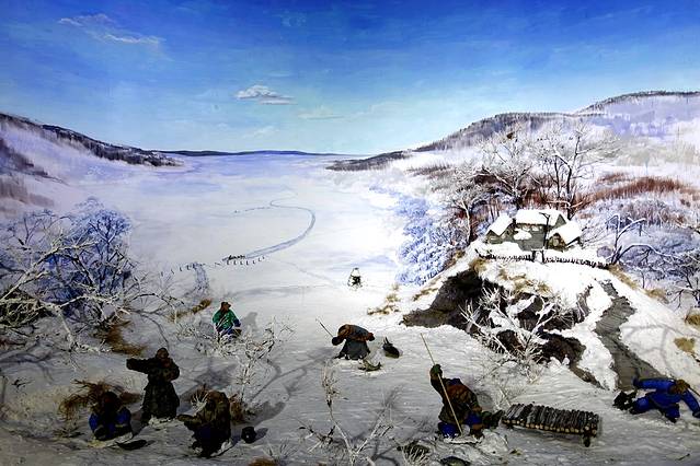 冬季捕鱼场景。赫哲族世世代代都靠捕鱼为生。鱼在他们的生活中占有非常重要的地位,他们用鱼肉充饥,用鱼皮做衣。每年的夏、秋两季,是捕鱼的最好时间。