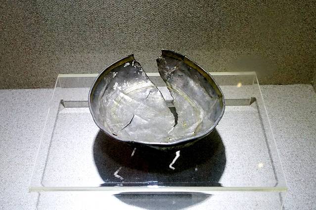 (国家二级保护文物)鎏金龙凤银碗 (辽金)。出土于八五九农场,是一个农民在耕地是时候犁出来的,所以破损严重。