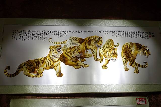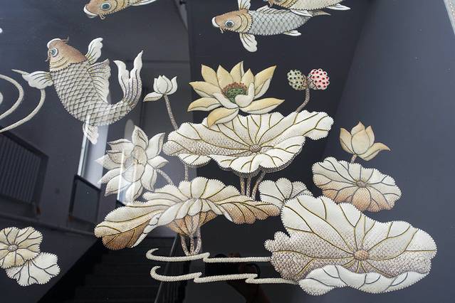 鱼皮立体缝制画(连年有余)。这鱼皮画用了78张大马哈鱼和9张鲤鱼鱼皮为原料缝制的。(楼道处反光较严重)