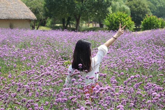 一大片马鞭草让少女很兴奋