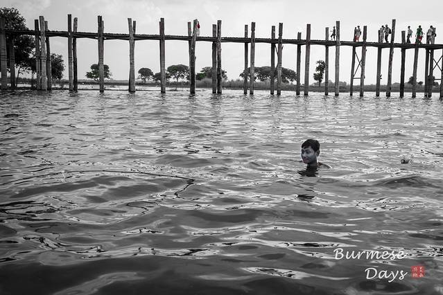 现在已经是旱季将至的时分,乌本桥的水位已经降到尴尬的状况,一个成年男子站在其中也不会没过头顶。