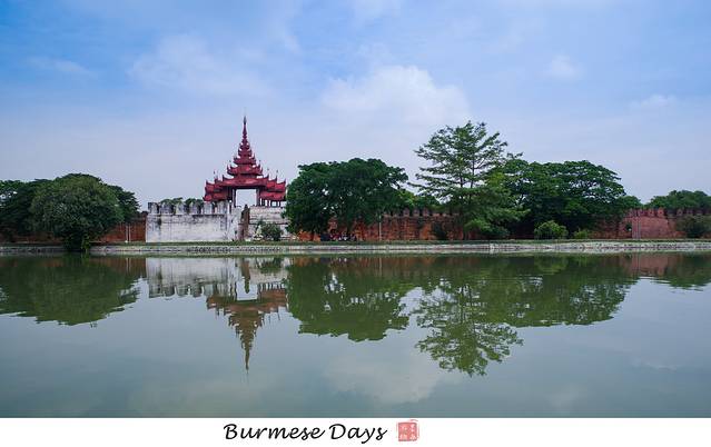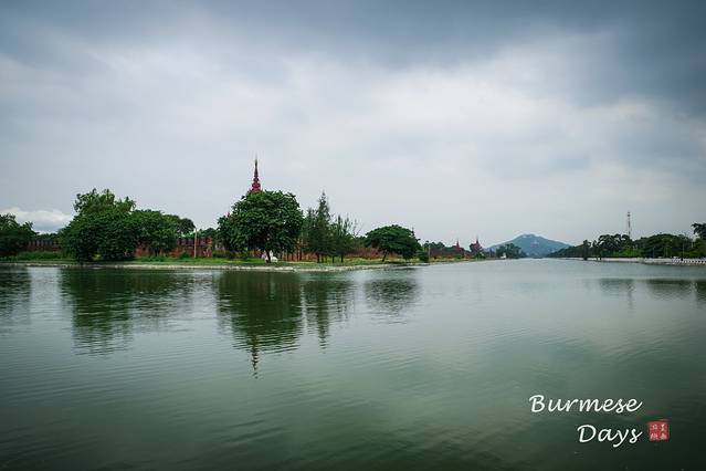 曼德勒皇宫四方正中,护城河环绕,一角是曼德勒山。