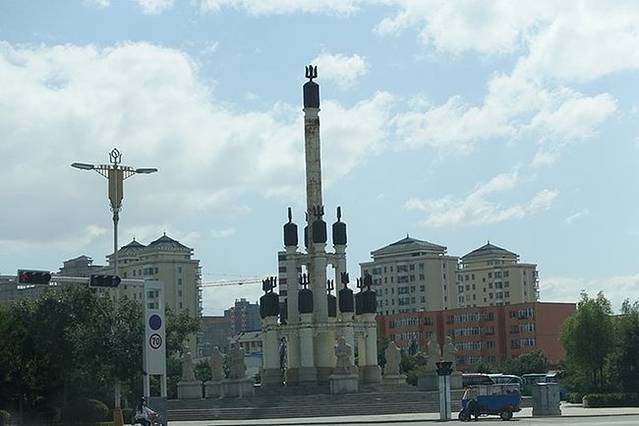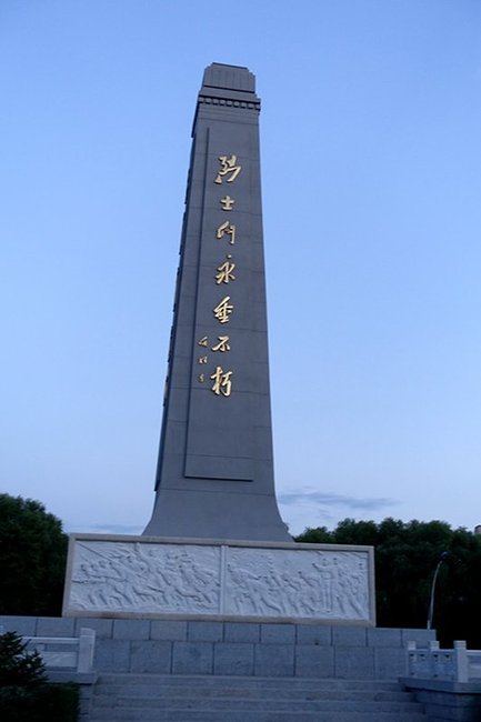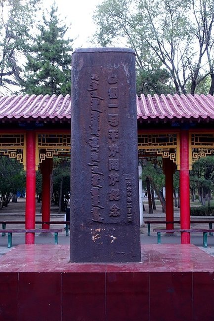 烈士纪念碑。碑身东西和南北面分别用蒙汉文镌刻着“烈士们永垂不朽”七个大字。