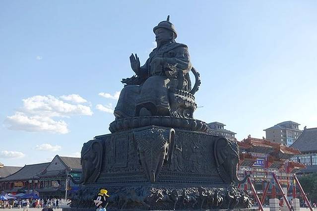 大召寺前阿拉坦汗广场上的阿拉坦汗(俺答汗)坐像。阿拉坦汗和他的夫人三娘子在兴建美岱召后不久,便决定另建第二座城寺,在明朝宫廷的支持下,万历七年(公元1579年)正式动工兴建。新建的城寺将城与寺分开,寺在城南的路西,第二年即告落成,城在又一年以后才告竣工。明廷赐寺名为弘慈寺,即现在的大召寺,城名为归化城(有“归顺明朝,接受教化”之意),即呼和浩特市旧城 。