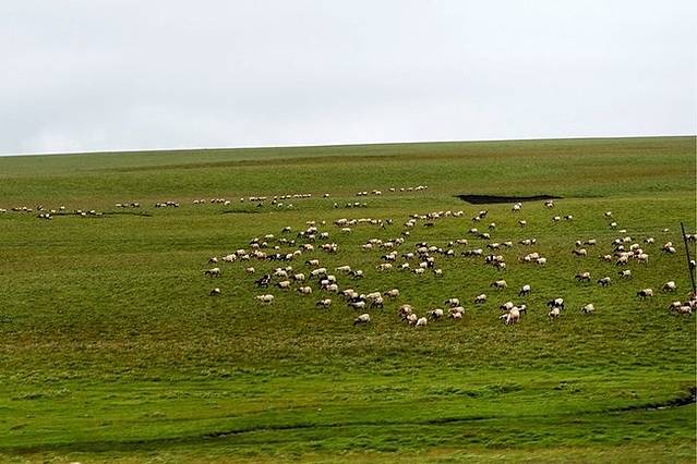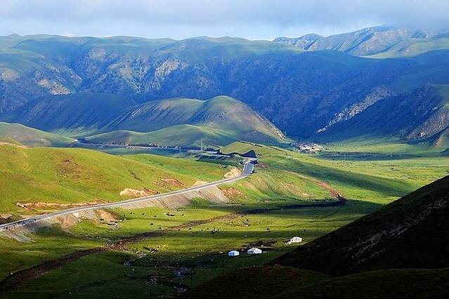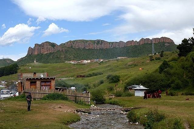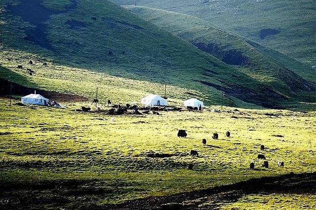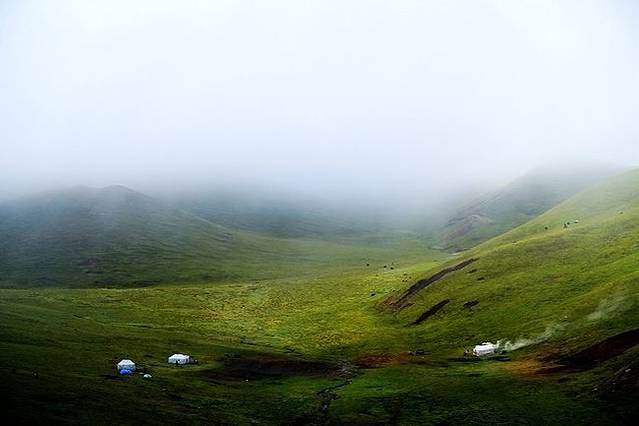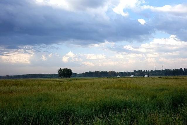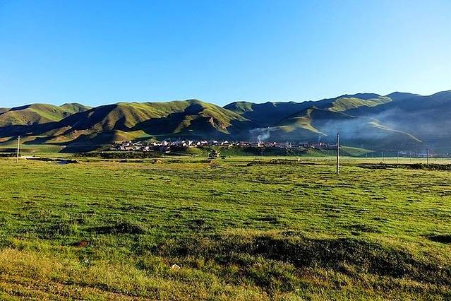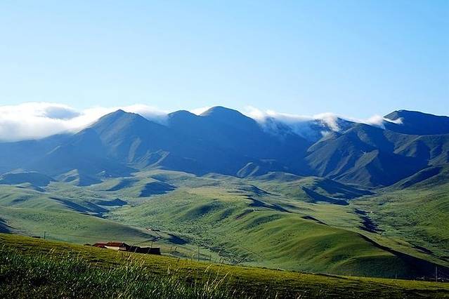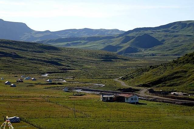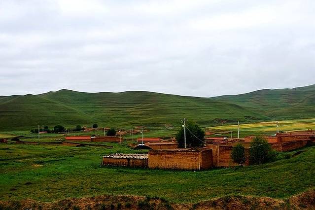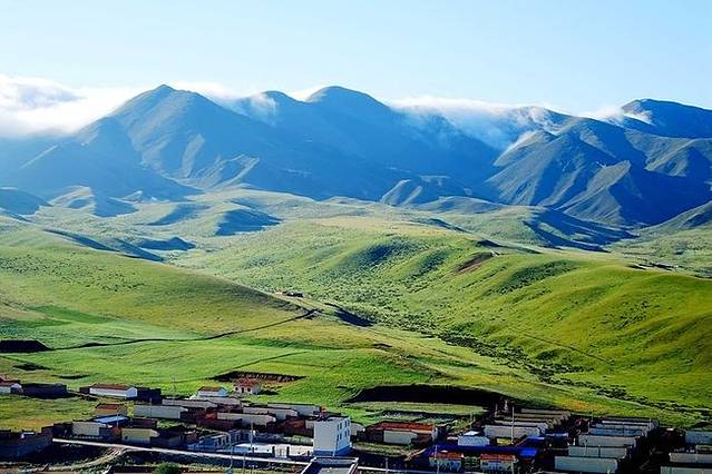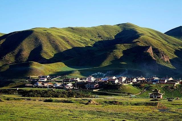 草原上竟然还有村落,简直是太幸福了呢。蓝天、白云、绿草都是他们的。