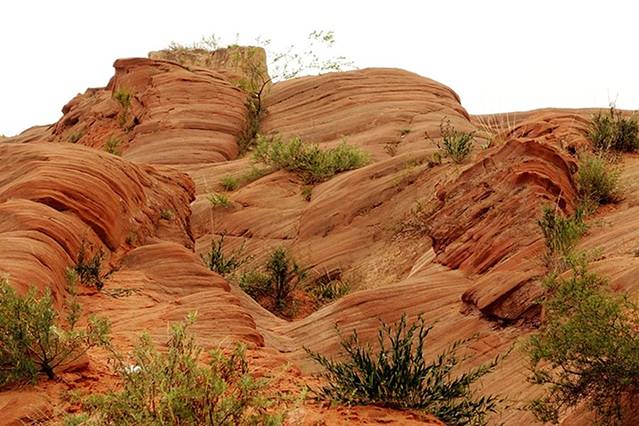 这里的红砂岩色彩单一,只有深浅之分,根据光线的不同会有一些变化