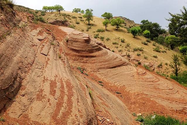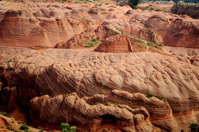 龙洲丹霞地貌是目前陕西规模最大的一个丹霞地貌景地,当地人称“波浪谷”、“红石峁”,也叫靖边红砂岩峡谷,位于黄土高原与毛乌素沙漠交汇地带。是一种红砂岩地貌,因岩砂上的纹路像波浪因而得名。这种红色的石头在学术上被称为"砒砂岩",靖边波浪谷形成约6000万年,很多砂土还没来得及凝固为岩石,砒砂岩区是自然界中风蚀与水蚀的过渡区,再加上重力侵蚀和人为侵蚀而形成。
