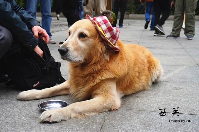 偶遇一老人,不是杂耍的,是自己的金毛,上面还停了只鸟!!!在路边喂水喝,很多行人就停下来围观了