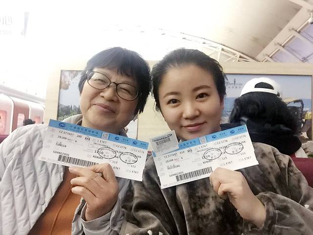 三人位落座,其实就是两人位,走廊再加一把凳子。俺娘的笑容越来越美了~