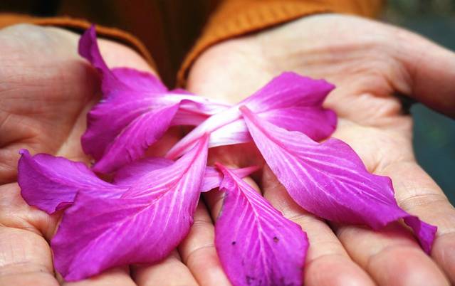 在落英满地的小路上,偏要拾一片黄树叶!我妈就比较正常地掬一捧花瓣~