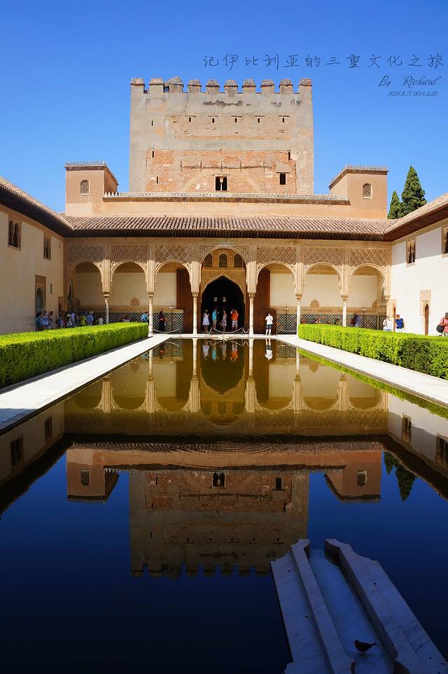 整个桃金娘中庭中,40米高的大使厅高塔及周边建筑、纤巧的立柱、优雅的拱券、以及回廊外墙上精致的传统格状图案,与清澈静谧的池水交相辉映,使人恍如处于漂浮空灵的圣地之中。