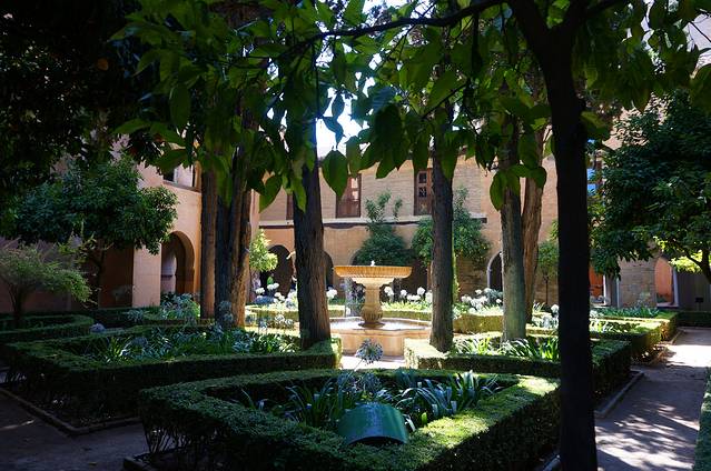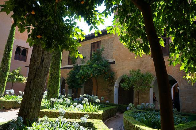 即便在阿尔汗布拉宫的后山,也有如此美丽的水景艺术——来自沙漠珍惜水源的阿拉伯人智慧可见一斑。在中世纪格拉纳达周边的平原,依靠的就是摩尔人设计的这些复杂的水系统,每天夜里以阿尔汗布拉宫的钟声为信号,沟渠闸门开关闭合使得山上下来的清水分流,灌溉平原上的庄稼,格拉纳达当年的富庶由此而来。