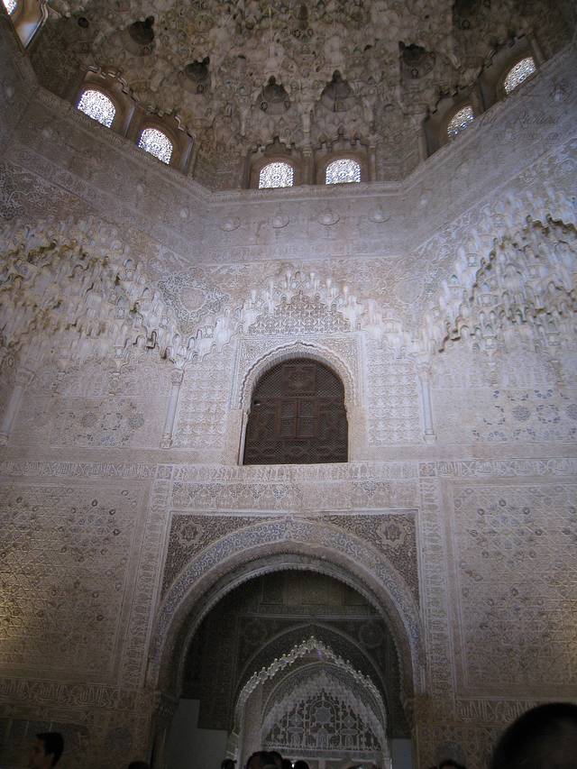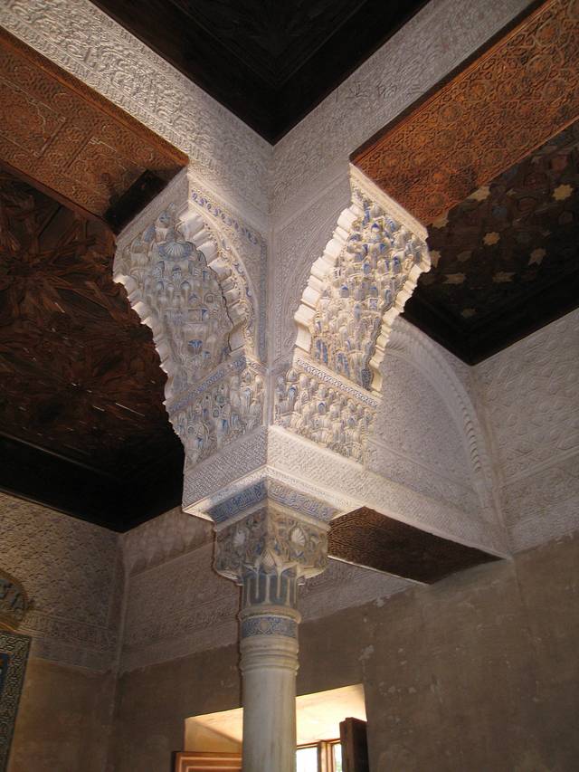 两姐妹厅奇巧诡谲、如蜂巢和钟乳石般的屋顶。厅内高处的四个房间由苏丹的四位爱妃居住,是为“两姐妹”;底部则由苏丹的母亲居住。四位爱妃谁先为苏丹生出王子即可被册封为后。
