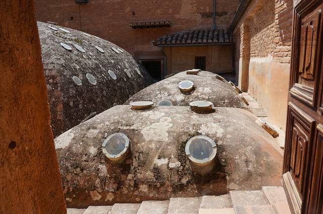 在两姐妹厅通向林达拉哈花园的后廊窗外,我们发现这些带着圆形天窗弧顶,类似科幻电影中宇宙飞船或是战争电影中的深海潜艇,咋看之下还真猜不出来它的功能——原来这些是皇家浴室的屋顶。