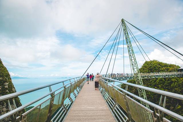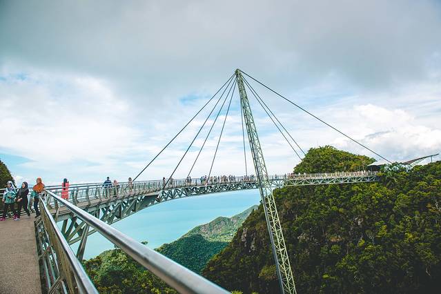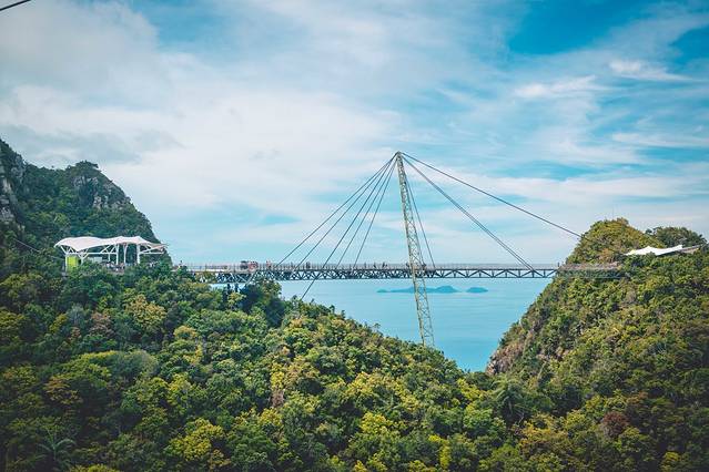 天空之桥(Skybridge),位于马来西亚的兰卡威(langkawi)群岛,建成于2004年10月,总长125米,桥形呈圆弧状,主体由钢材料构成。又大又重的“钢架”居然只用了一根支柱来支撑,支柱高87米,被固定在山腰,然后再由8根钢缆牵引,整个桥就这样最终被“吊”在了海拔687米的高空,连接着两个山头,取名天空之桥(Langkawi Sky Bridge)的缘由。