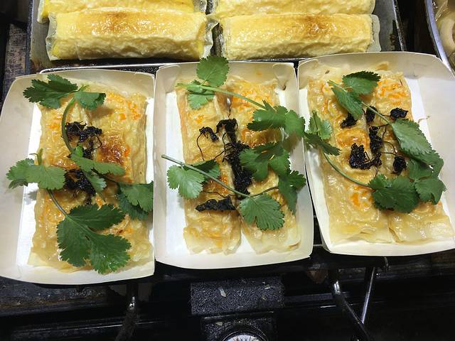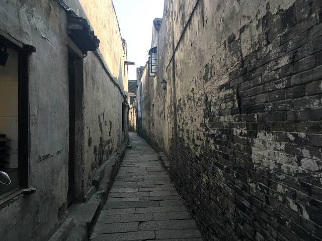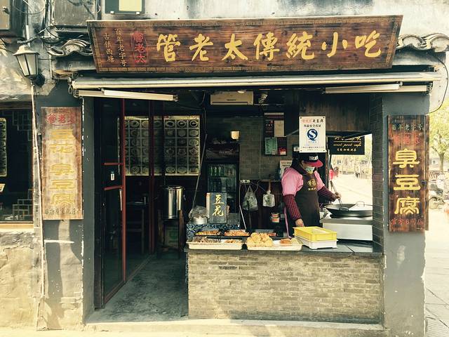 我们在老板娘那里买了两张景区门票,50元/人,刷身份证就可以进去。四点半以后,进西塘景区是不需要门票的,但是里面8个小景点如根雕、纽扣博物馆、王宅等就不能进去了。我们拿了张地图,就从客栈出发,路上经过一个富有年代感的福利院,现在已经没有人了。大约走了5分钟,我们到达景区入口”唐家弄”,一条看不到头的狭小道路,路的尽头就是西塘非物质文化遗产“管老太臭豆腐”。此时,也正是饭点,我们就此小吃起来,点了一份臭豆腐7块,10元;一份葱香煎包8个,15元;一碗桂花豆腐花,4元;一份脆骨,15元。